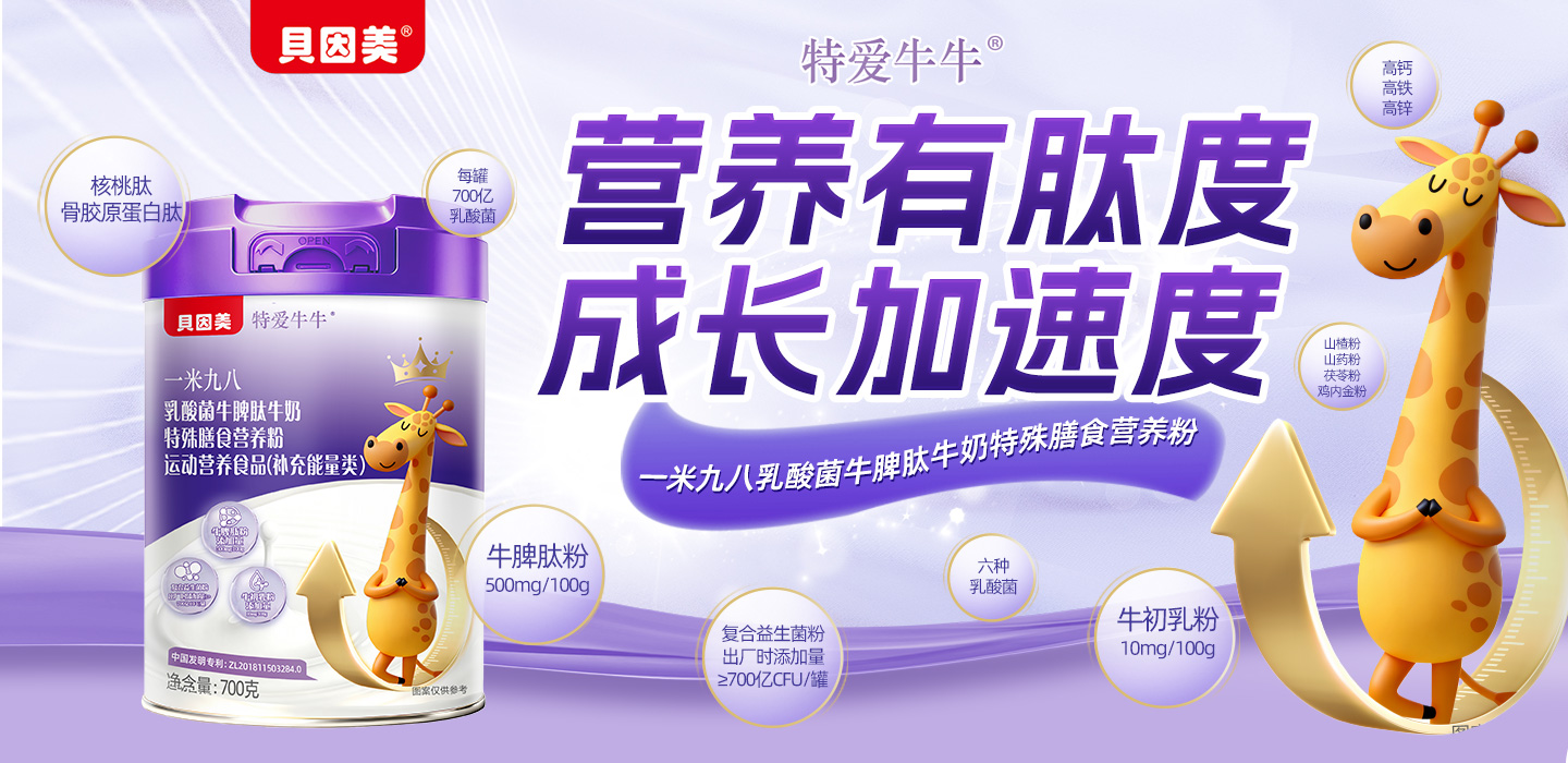貝因美特愛牛牛一米九八乳酸菌牛脾肽牛奶特殊膳食營養(yǎng)粉,中國發(fā)明專利:ZL201811503284.0,安全放心!每100添加牛脾肽粉500mg,牛初乳粉10mg,復(fù)合益生菌粉出廠時(shí)添加量≥700億CFU/罐,科學(xué)配方,優(yōu)質(zhì)營養(yǎng)!專為3-15歲兒童骨骼生長黃金期設(shè)計(jì),營養(yǎng)有肽度,成長加速度!