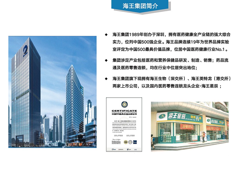 海王集團旗下現擁有海王生物(深交所)、海王英特龍(港交所)兩家上市公司,以及國內醫(yī)藥零售連鎖龍頭企業(yè)-海王星辰﹔
