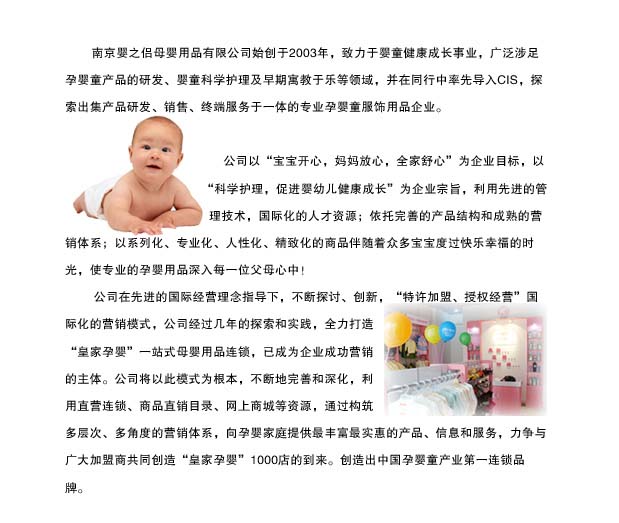 公司以“寶寶開(kāi)心,媽媽放心,全家舒心”為企業(yè)目標(biāo),以“科學(xué)護(hù)理,促進(jìn)嬰幼兒健康成長(zhǎng)”為企業(yè)宗旨,利用先進(jìn)的管理技術(shù),國(guó)際化的人才資源;依托強(qiáng)大的品牌效應(yīng),完善的產(chǎn)品結(jié)構(gòu)和成熟的營(yíng)銷(xiāo)體系;以系列化、專(zhuān)業(yè)化、人性化、精致化的商品伴隨著眾多寶寶度過(guò)快樂(lè)幸福的時(shí)光,使專(zhuān)業(yè)的孕嬰用品深入每一位父母心中!