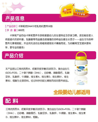卡咪呢有機米粉系列是專為中國寶寶設計的營養(yǎng)輔食,選用有機大米,科學搭配維生素AD等維生素,還特別添加;撬、DHA、AA等有助智力發(fā)育的營養(yǎng)成分,富含15種營養(yǎng)素,F上海卡咪呢母嬰用品有限公司面向全國空白市場區(qū)域誠招卡咪呢有機米粉代理商。