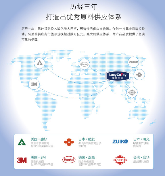 LUCYCAREY露茜凱瑞成長褲選用全球頂尖供應商的紙尿褲原材料:住友、三大雅高分子吸水材料;美國3M魔術貼;德國萊卡松緊帶;美國進口原生木漿;德國漢高粘合劑;美國、日本進口無紡布;進口超柔軟透氣底膜等。另外,全世界zui先進的全自動紙尿褲生產線,年產銷數(shù)億片紙尿褲的成熟的生產制造團隊,確保產品高品質。