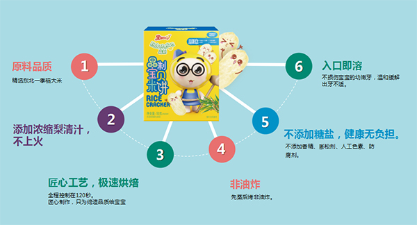 每款口味均首創(chuàng)特別添加了梨清汁,梨汁的清甜與米餅完美融合,保證了米餅口味的天然,不添加糖鹽,健康無負擔。