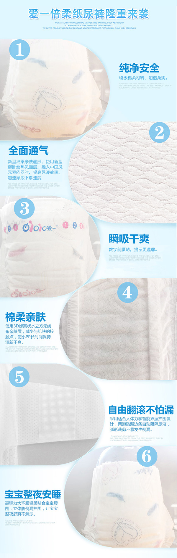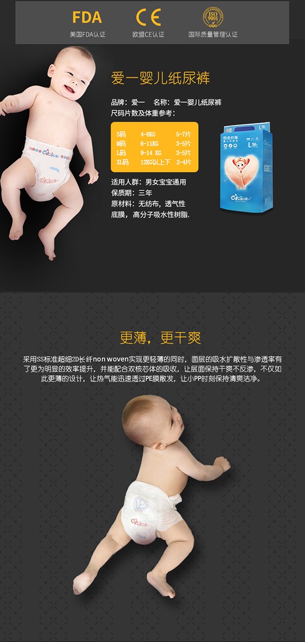 愛(ài)一唯愛(ài)系列紙尿褲,精選綿柔材料,絲綢般柔軟,猶如云朵般舒適,呵護(hù)幼嫩肌膚,媽媽更安心;全芯體設(shè)計(jì),纖薄柔軟,高能吸水分子,瞬間吸收,持久鎖濕,不反滲,表層時(shí)刻干爽。