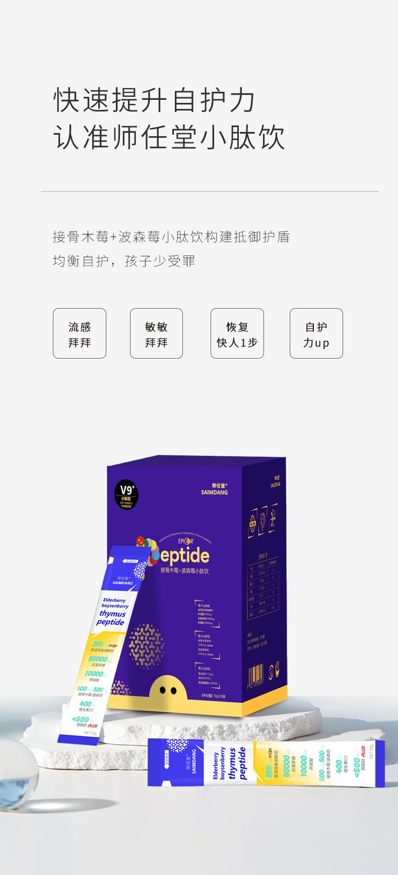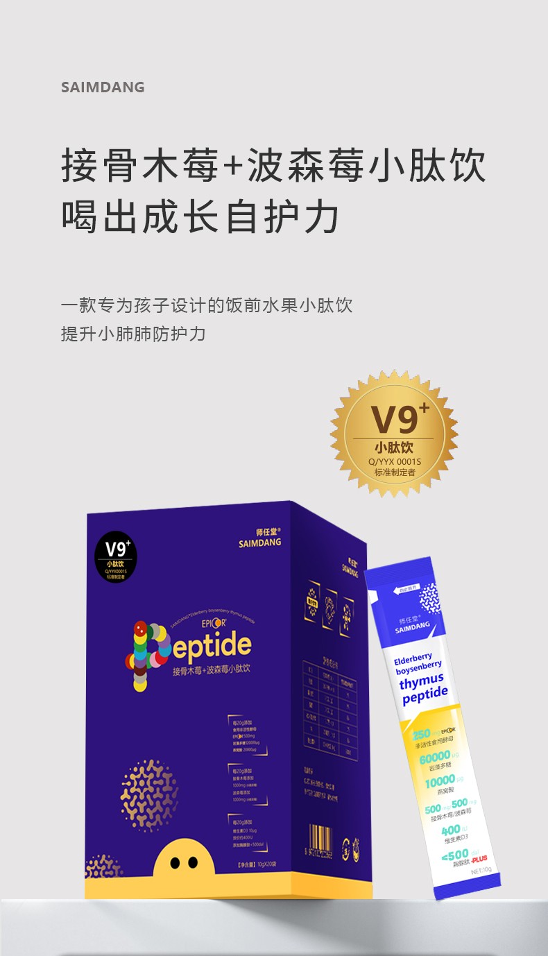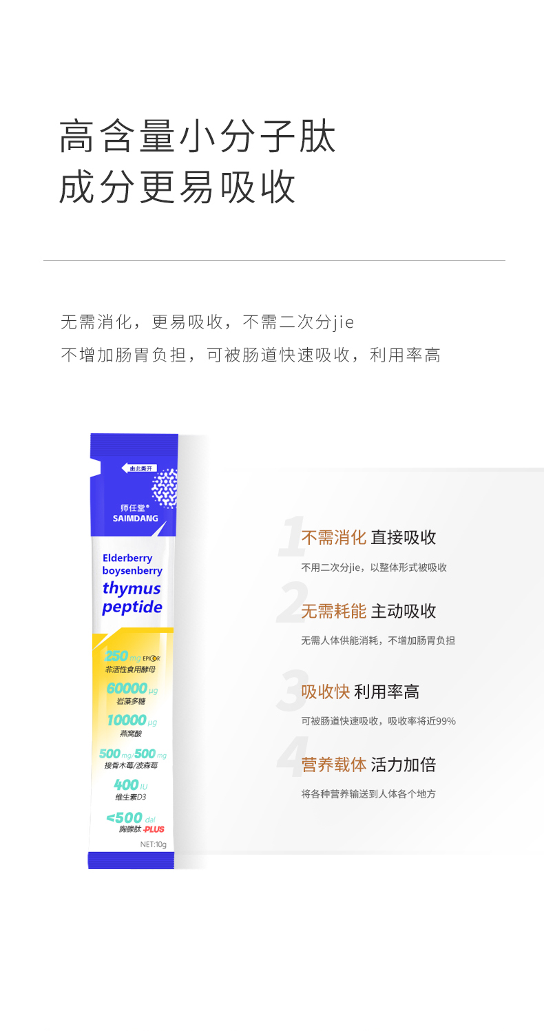 師任堂接骨木莓+波森莓小肽飲,每20g添加非活性食用酵母500mg、巖藻多糖120000μg、燕窩酸20000μg、接骨木莓1000mg、波森莓1000mg、維生素D3 800iu,以及胸腺肽,七大核心成分,小分子,易吸收,均衡免疫,升級防護力。獨立包裝好攜帶,撕開溫水一沖就能喝,清甜莓果味,寶寶喝的開心,媽媽也放心!