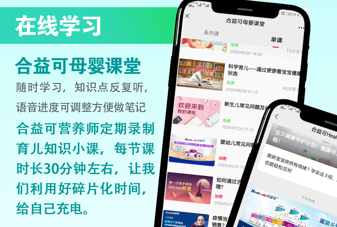 除了線上線下統(tǒng)一培訓(xùn),我們還為合作門店學(xué)員提供了母嬰營養(yǎng)知識學(xué)習(xí)課堂,課程聚焦寶寶常見喂養(yǎng)問題、過敏、腸道菌群、鈣鐵鋅元素缺乏等育兒知識,商學(xué)院老師將定期錄制育兒知識小課,每節(jié)課時長在30分鐘,方便學(xué)員利用碎片化時間去學(xué)習(xí)更多的知識,公眾號的母嬰課堂還有一個特點就是能隨時聽、反復(fù)聽、語音進(jìn)度可調(diào)整。