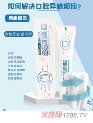幽感靈口腔抑菌膏采用多種草本植物精制而成,主要成分有生物溶解酶,白芨提取物,金銀花提取物,連翹提取物,能夠抗菌溶菌,清潔口腔,清新口氣,添加高效安全的抗抑菌劑,可抑制出門螺桿菌,從源頭解決菌源性口臭。