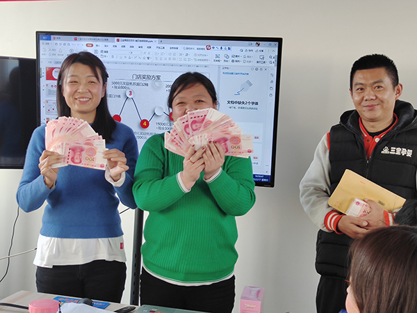除了新品的講解,“施貝安”品牌針對(duì)線下門店所推出的門店獎(jiǎng)勵(lì)方案亦是誠意滿滿,給銷售冠軍們的獎(jiǎng)勵(lì)更是絲毫不含糊!白花花的百元大鈔送到各位銷售精英的手中,看著她們一個(gè)個(gè)洋溢著幸福的笑臉,亦是對(duì)“施貝安”品牌的高度認(rèn)可!