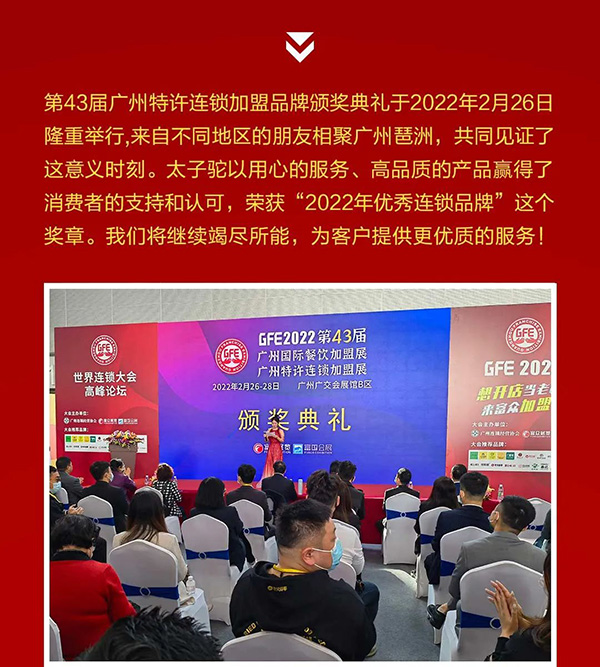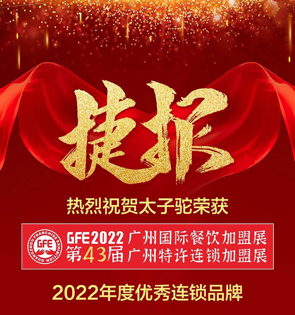 熱烈祝賀太子駝榮獲 “ 2022年優(yōu)秀連鎖品牌 ”