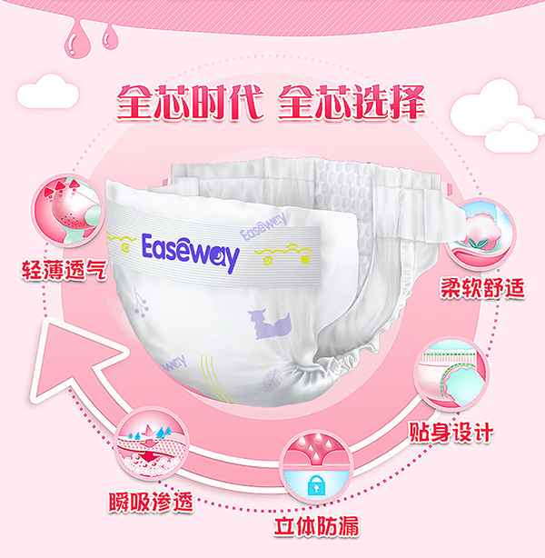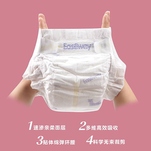 宜氏紙尿褲,進口高分子薄型吸液芯體,獨特凹槽設計,立體多維吸收,倍量瞬吸,干爽舒適,大吸量,整夜無憂。速滲親柔面層,多維高效吸收,貼體綿彈環(huán)腰,科學無束裁剪,雙層拒水防漏,全方位透氣設計,110mm加寬芯體,雙倍瞬吸,不斷層,不起坨。3D打孔親膚層,打孔表層在皮膚和尿褲之間形成空氣通道,當尿液接觸的時候,首先流入打孔通道中快速吸收,使皮膚接觸面始終保持干爽。