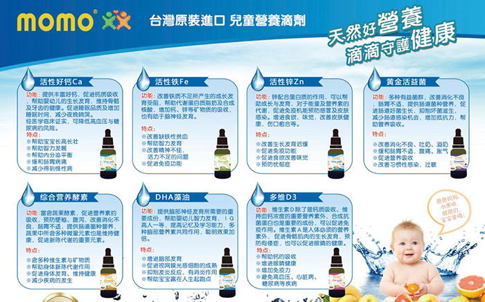 momo營(yíng)養(yǎng)素滴劑系列,100%臺(tái)灣原罐原裝,正規(guī)進(jìn)口食品,安全有保障。臺(tái)灣專業(yè)研發(fā)團(tuán)隊(duì),采用本土原材料,采用嚴(yán)格的自我生產(chǎn)管理系統(tǒng),從 產(chǎn)品開發(fā)、原來(lái)生產(chǎn)到末端產(chǎn)品的包裝,提供完整的品質(zhì)服務(wù),F(xiàn)正面向全國(guó)招商中,有意向者現(xiàn)在就可以通過(guò)火爆嬰童網(wǎng)進(jìn)行留言咨詢。